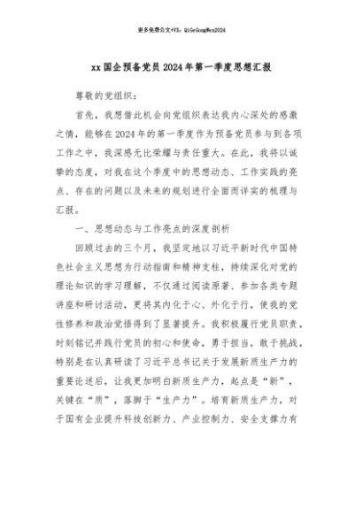 / 【七哥公文】2024年:xx国企预备党员2024年第一季度思想汇报+更多免费公文+VX:QiGeGongWen2024