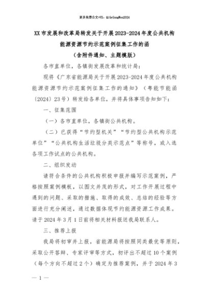 【七哥公文】2024年:XX市发展和改革局转发关于开展2023-2024年度公共机构能源资源节约示范案例征集工作的函(含附件通知、主题模版)+更多免费公文+VX:QiGeGongWen2024
