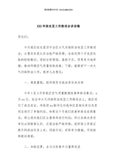 【七哥公文】2024年:XXX环保攻坚工作推进会讲话稿+更多免费公文+VX:QiGeGongWen2024