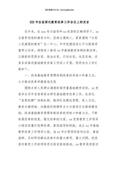 / 【七哥公文】2024年:XXX市在省深化教育改革工作会议上的发言+更多免费公文+VX:QiGeGongWen2024