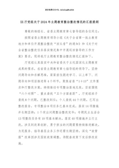 【七哥公文】2024年:XX厅党组关于2024年主题教育整治整改情况的汇报提纲+更多免费公文+VX:QiGeGongWen2024