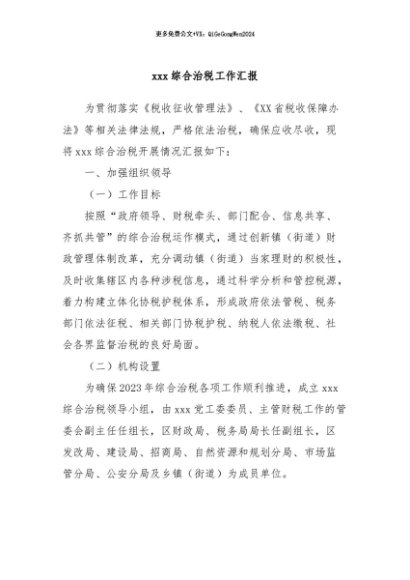 / 【七哥公文】2024年:xxx综合治税工作汇报+更多免费公文+VX:QiGeGongWen2024