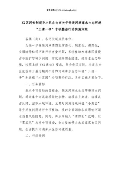 【七哥公文】2024年:XX区河长制领导小组办公室关于开展河湖库水生态环境“三清一净”专项整治行动实施方案+更多免费公文+VX:QiGeGongWen2024