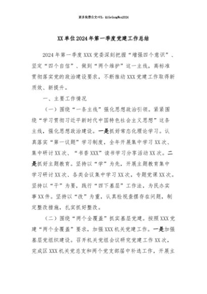 / 【七哥公文】2024年:XX单位2024年第一季度党建工作总结+更多免费公文+VX:QiGeGongWen2024