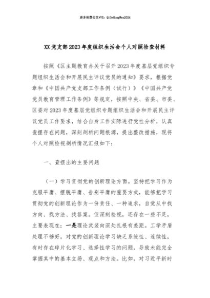 / 【七哥公文】2024年:XX党支部2023年度组织生活会个人对照检查材料+更多免费公文+VX:QiGeGongWen2024