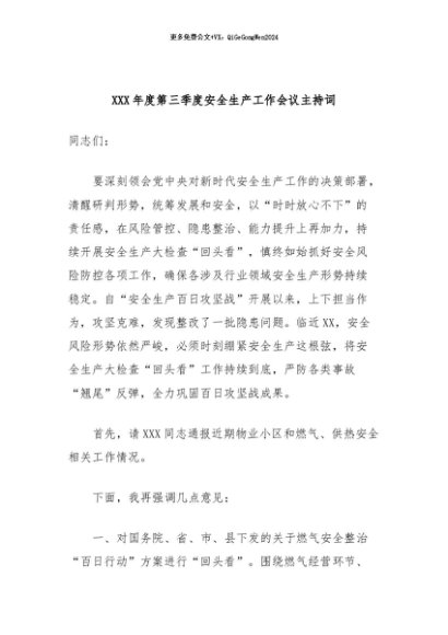 / 【七哥公文】2024年:XXX年度第三季度安全生产工作会议主持词+更多免费公文+VX:QiGeGongWen2024