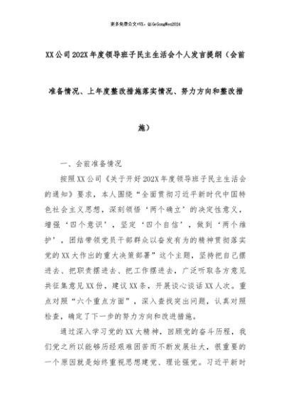 【七哥公文】2024年:XX公司202X年度领导班子民主生活会个人发言提纲(会前准备情况、上年度整改措施落实情况、努力方向和整改措施)+更多免费公文+VX:QiGeGongWen2024