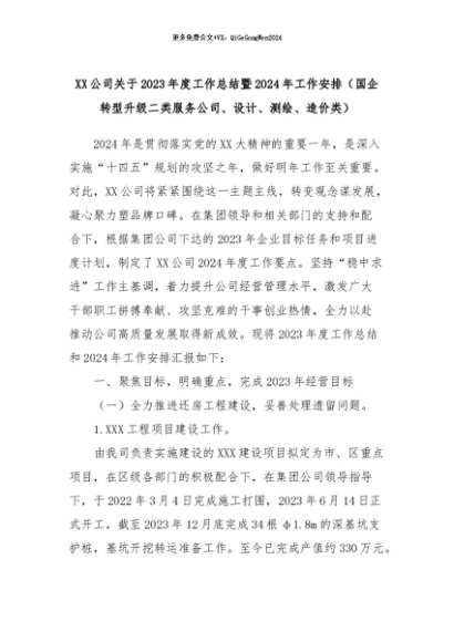 【七哥公文】2024年:XX公司关于2023年度工作总结暨2024年工作安排(国企转型升级二类服务公司、设计、测绘、造价类)+更多免费公文+VX:QiGeGongWen2024