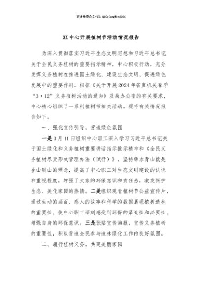 / 【七哥公文】2024年:XX中心开展植树节活动情况报告+更多免费公文+VX:QiGeGongWen2024