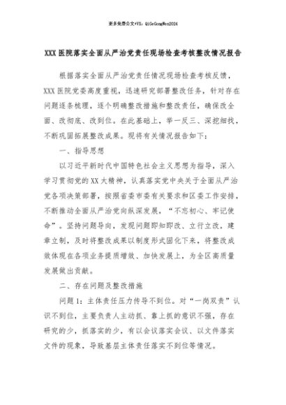 【七哥公文】2024年:XXX医院落实全面从严治党责任现场检查考核整改情况报告+更多免费公文+VX:QiGeGongWen2024