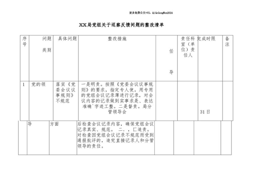 / 【七哥公文】2024年:xx-局党组关于巡察反馈问题的整改清单+更多免费公文+VX:QiGeGongWen2024