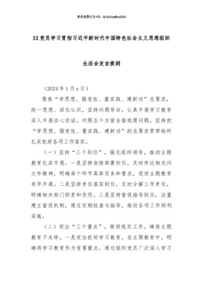 【七哥公文】2024年:XX党员学习贯彻习近平新时代中国特色社会主义思想组织生活会发言提纲+更多免费公文+VX:QiGeGongWen2024
