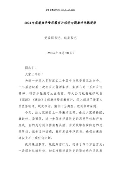 / 【七哥公文】2024年:2024年观看廉洁警示教育片活动专题廉洁党课提纲+更多免费公文+VX:QiGeGongWen2024