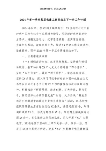 【七哥公文】2024年:2024年第一季度基层党建工作总结及下一步工作计划+更多免费公文+VX:QiGeGongWen2024