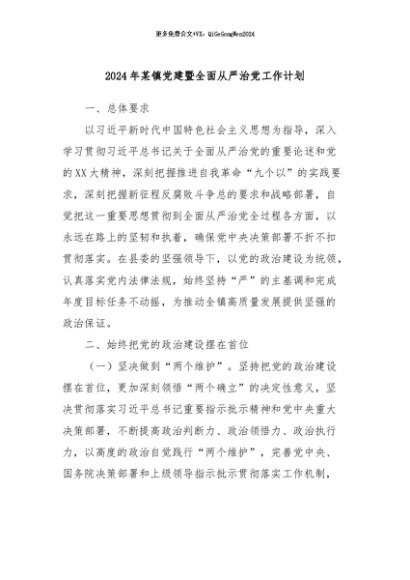 / 【七哥公文】2024年:2024年某镇党建暨全面从严治党工作计划+更多免费公文+VX:QiGeGongWen2024