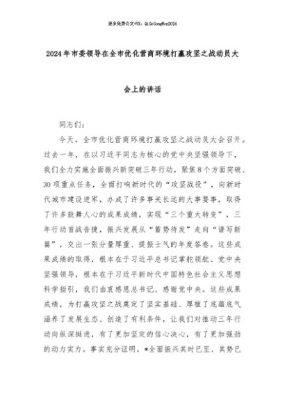【七哥公文】2024年:2024年市委领导在全市优化营商环境打赢攻坚之战动员大会上的讲话+更多免费公文+VX:QiGeGongWen2024