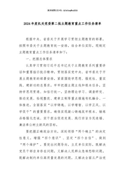 【七哥公文】2024年:2024年度机关党委第二批主题教育重点工作任务清单+更多免费公文+VX:QiGeGongWen2024