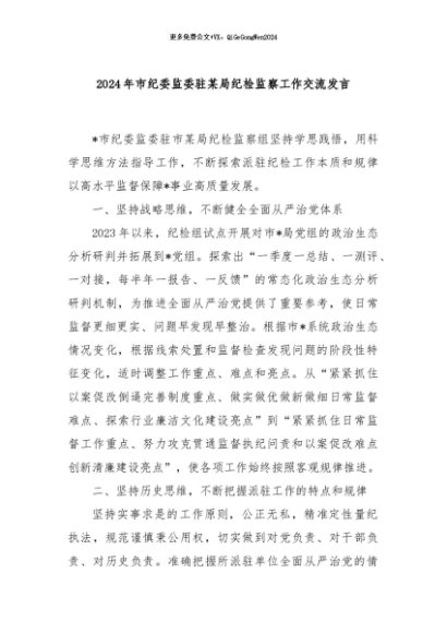 / 【七哥公文】2024年:2024年市纪委监委驻某局纪检监察工作交流发言+更多免费公文+VX:QiGeGongWen2024