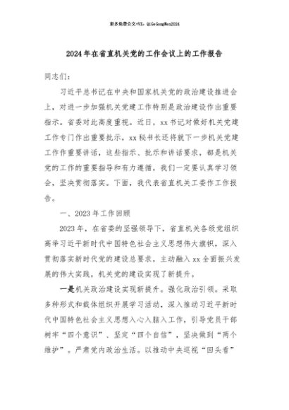 / 【七哥公文】2024年:2024年在省直机关党的工作会议上的工作报告+更多免费公文+VX:QiGeGongWen2024
