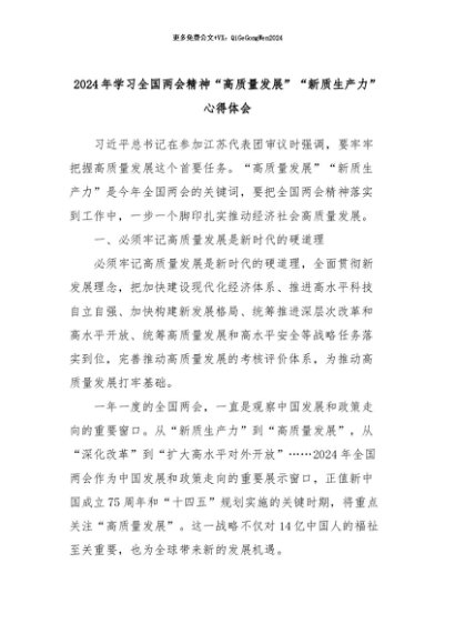 【七哥公文】2024年:2024年学习全国两会精神“高质量发展”“新质生产力”心得体会+更多免费公文+VX:QiGeGongWen2024