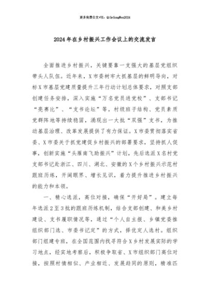 / 【七哥公文】2024年:2024年在乡村振兴工作会议上的交流发言.+更多免费公文+VX:QiGeGongWen2024
