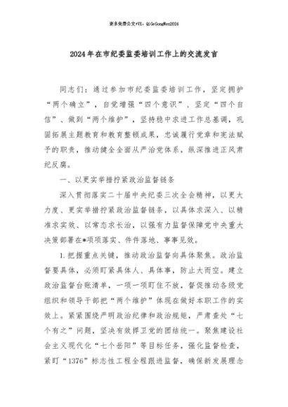 / 【七哥公文】2024年:2024年在市纪委监委培训工作上的交流发言+更多免费公文+VX:QiGeGongWen2024