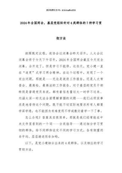 【七哥公文】2024年:2024年全国两会,基层党组织针对4类群体的7种学习贯彻方法.+更多免费公文+VX:QiGeGongWen2024