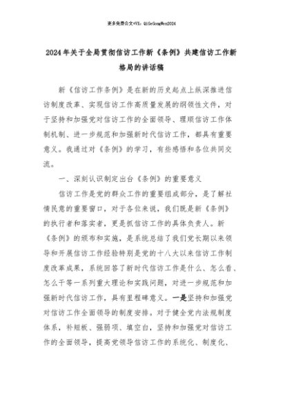 【七哥公文】2024年:2024年关于全局贯彻信访工作新《条例》共建信访工作新格局的讲话稿+更多免费公文+VX:QiGeGongWen2024
