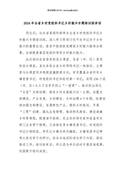 【七哥公文】2024年:2024年全省乡村党组织书记乡村振兴专题培训班讲话+更多免费公文+VX:QiGeGongWen2024