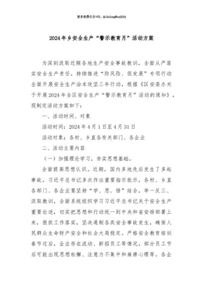 / 【七哥公文】2024年:2024年乡安全生产“警示教育月”活动方案+更多免费公文+VX:QiGeGongWen2024