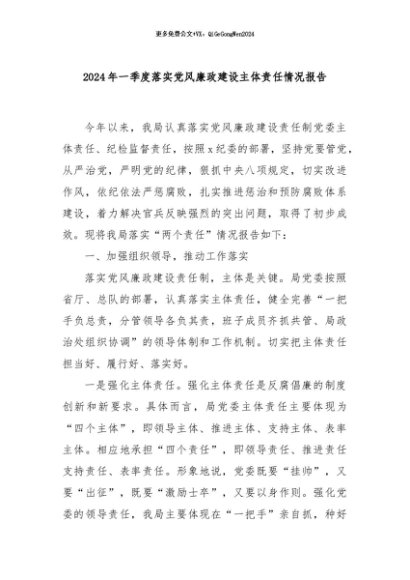 / 【七哥公文】2024年:2024年一季度落实党风廉政建设主体责任情况报告+更多免费公文+VX:QiGeGongWen2024
