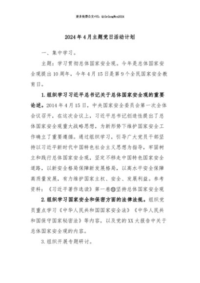 / 【七哥公文】2024年:2024年4月主题党日活动计划+更多免费公文+VX:QiGeGongWen2024