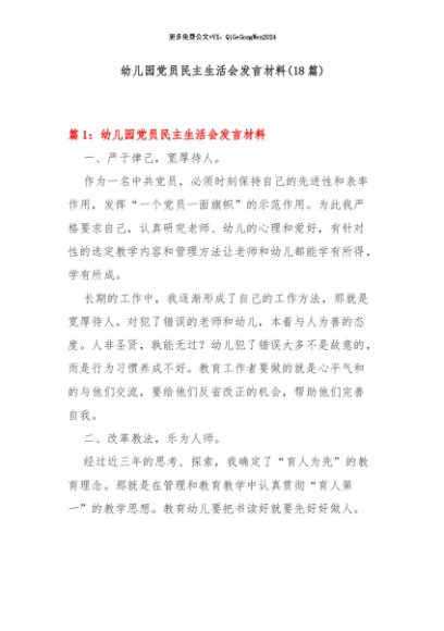 【七哥公文】2024年:(18篇)幼儿园党员民主生活会发言材料+更多免费公文+VX:QiGeGongWen2024
