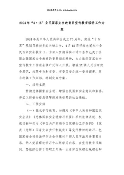 【七哥公文】2024年:2024年“4·15”全民国家安全教育日宣传教育活动工作方案+更多免费公文+VX:QiGeGongWen2024
