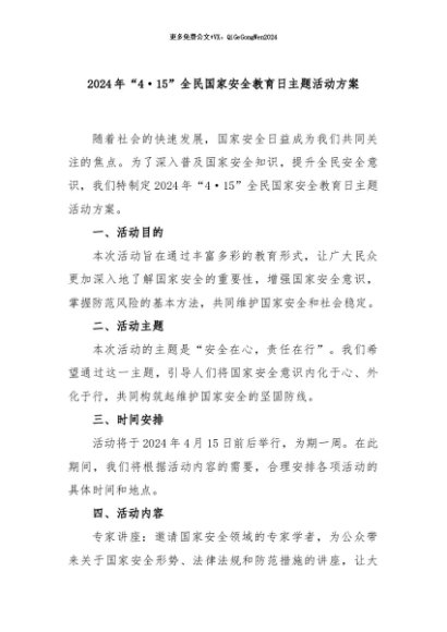 【七哥公文】2024年:2024年“4·15”全民国家安全教育日主题活动方案+更多免费公文+VX:QiGeGongWen2024