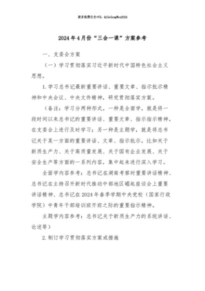/ 【七哥公文】2024年:2024年4月份“三会一课”方案参考+更多免费公文+VX:QiGeGongWen2024