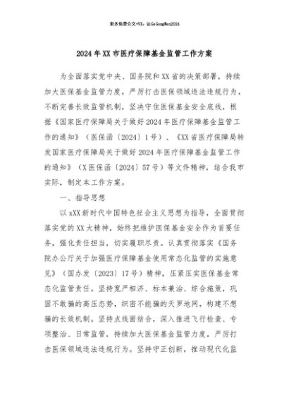 / 【七哥公文】2024年:2024年XX市医疗保障基金监管工作方案+更多免费公文+VX:QiGeGongWen2024