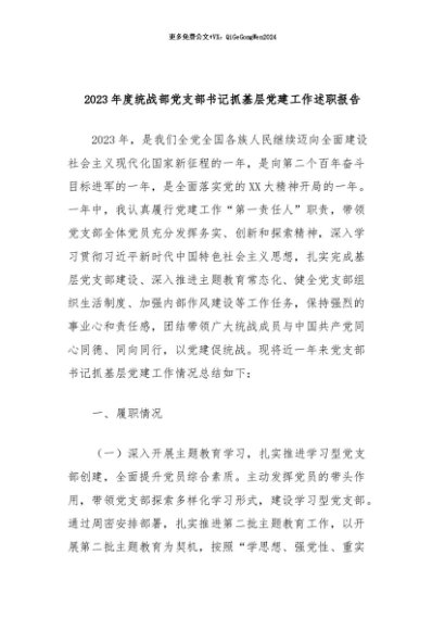 【七哥公文】2024年:2023年度统战部党支部书记抓基层党建工作述职报告+更多免费公文+VX:QiGeGongWen2024