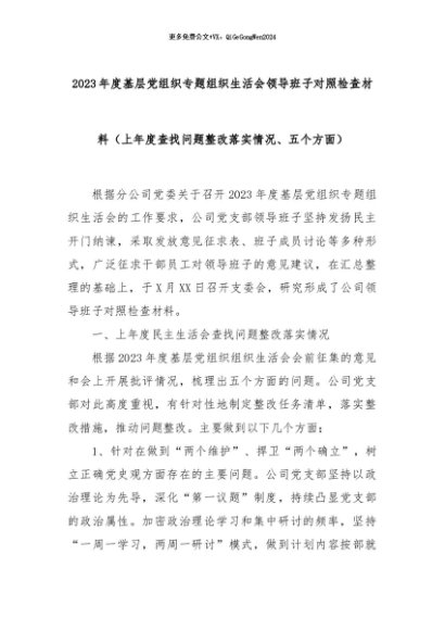 【七哥公文】2024年:2023年度基层党组织专题组织生活会领导班子对照检查材料(上年度查找问题整改落实情况、五个方面)+更多免费公文+VX:QiGeGongWen2024
