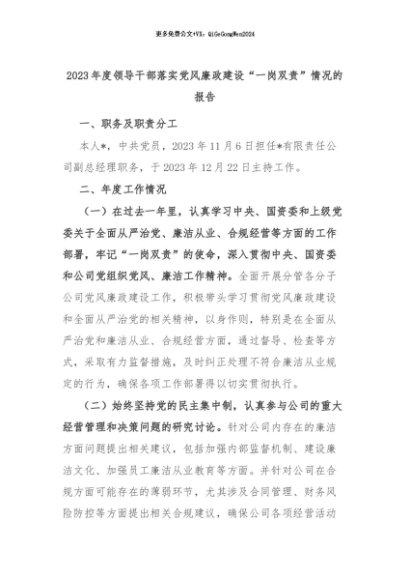 【七哥公文】2024年:2023年度领导干部落实党风廉政建设“一岗双责”情况的报告+更多免费公文+VX:QiGeGongWen2024