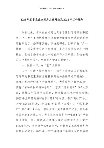 【七哥公文】2024年:2023年度市农业农村局工作总结及2024年工作谋划+更多免费公文+VX:QiGeGongWen2024