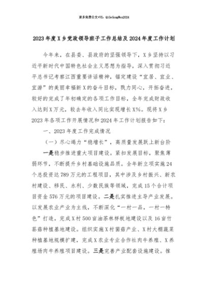 【七哥公文】2024年:2023年度X乡党政领导班子工作总结及2024年度工作计划+更多免费公文+VX:QiGeGongWen2024