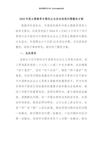 【七哥公文】2024年:2023年度主题教育专题民主生活会检视问题整改方案+更多免费公文+VX:QiGeGongWen2024