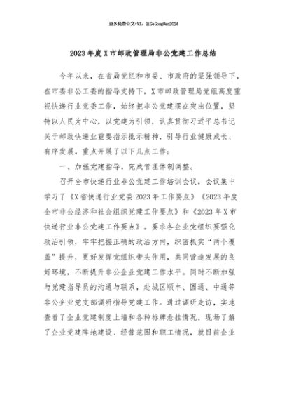 / 【七哥公文】2024年:2023年度X市邮政管理局非公党建工作总结+更多免费公文+VX:QiGeGongWen2024