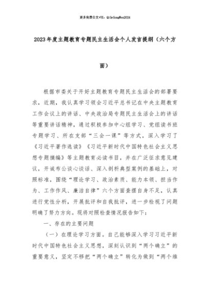 【七哥公文】2024年:2023年度主题教育专题民主生活会个人发言提纲(六个方面)+更多免费公文+VX:QiGeGongWen2024