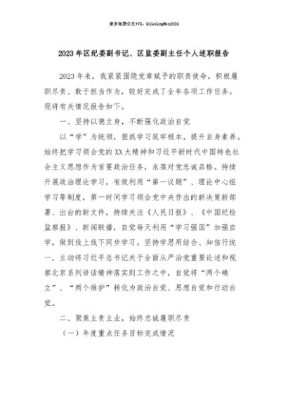 / 【七哥公文】2024年:2023年区纪委副书记、区监委副主任个人述职报告+更多免费公文+VX:QiGeGongWen2024