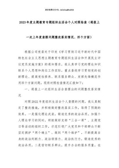【七哥公文】2024年:2023年度主题教育专题组织生活会个人对照检查(通报上一次上年度查摆问题整改落实情况、四个方面)+更多免费公文+VX:QiGeGongWen2024