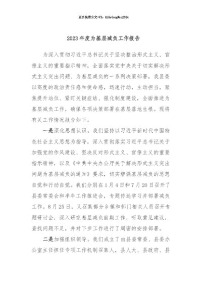 / 【七哥公文】2024年:2023年度为基层减负工作报告+更多免费公文+VX:QiGeGongWen2024