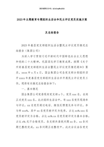 【七哥公文】2024年:2023年主题教育专题组织生活会和民主评议党员实施方案及总结报告+更多免费公文+VX:QiGeGongWen2024