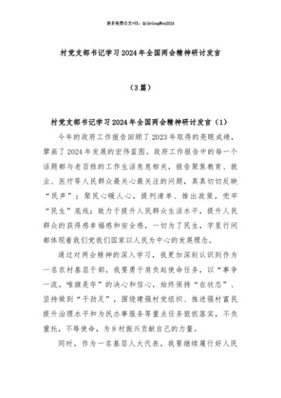 【七哥公文】2024年:(3篇)村党支部书记学习2024年全国两会精神研讨发言+更多免费公文+VX:QiGeGongWen2024
